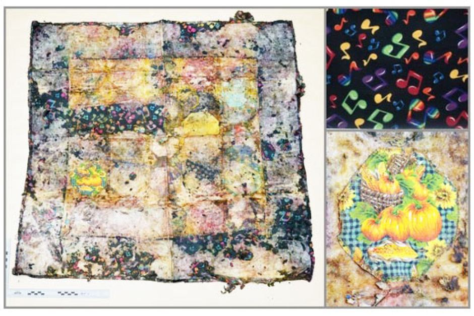 The quilt, which police are certain is homemade, is 70cm x 70cm (approximately 27″ x 27″) appears to be a snowball pattern quilt. Some of the snowballs feature pumpkins, stars, teddy bears, and a camel. The border fabric is rainbow colored musical notes.